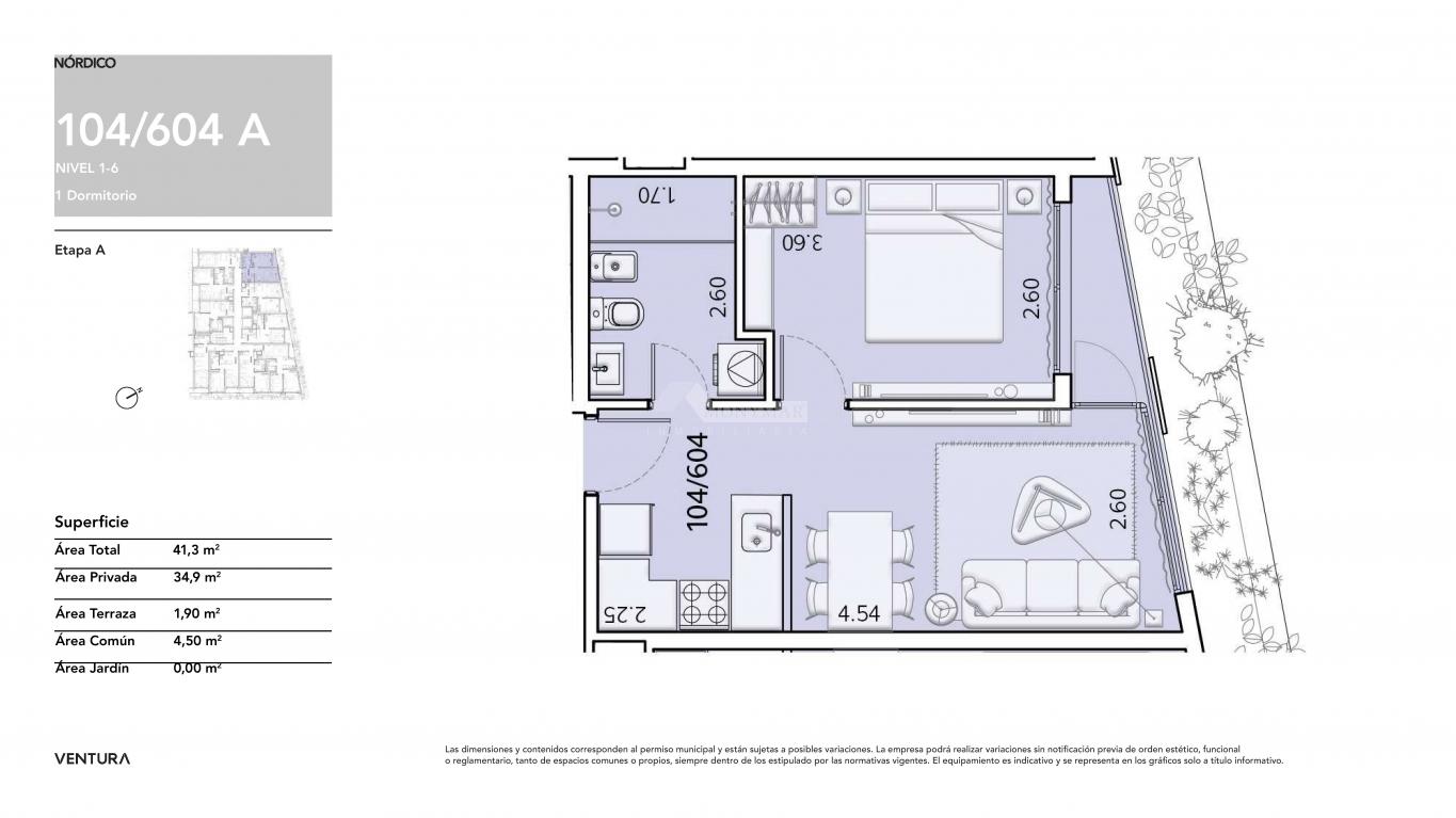 104 a 604) 34,9m área propia + 1,90m terraza + 4,50m área común = Total 41,3m.