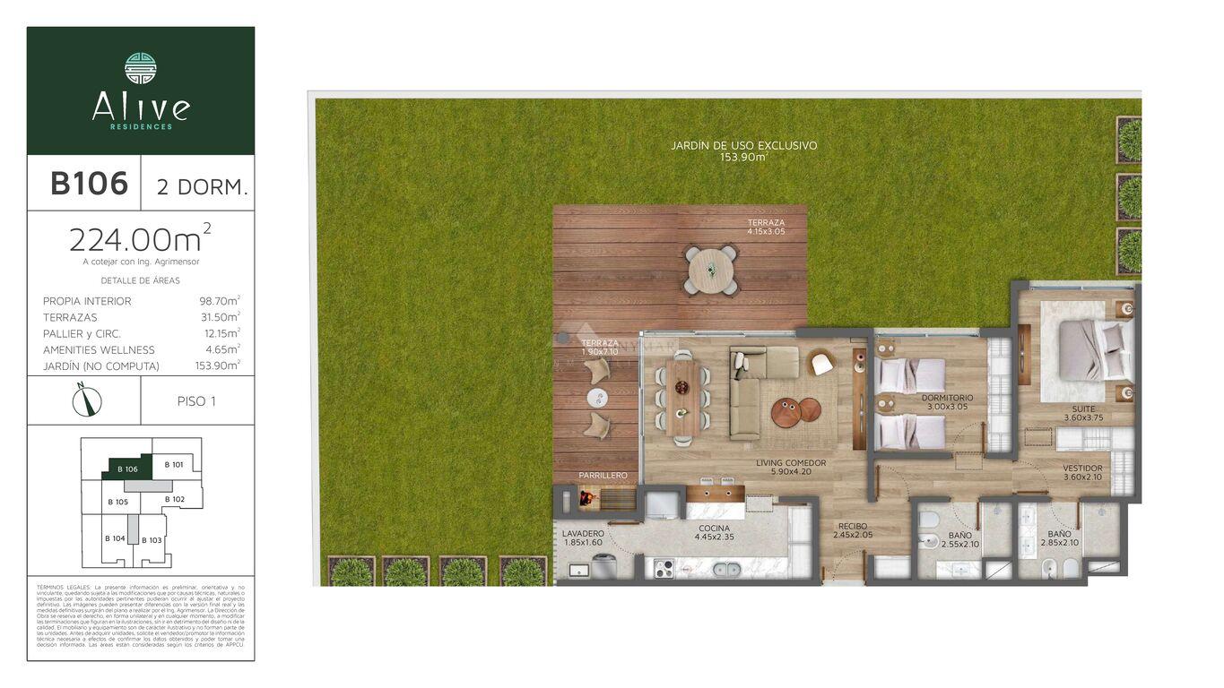 B106) 98,7m2 área propia + 31,50m2 terrazas + 16,80m2 área común + Jardín de uso exclusivo = 224m totales.