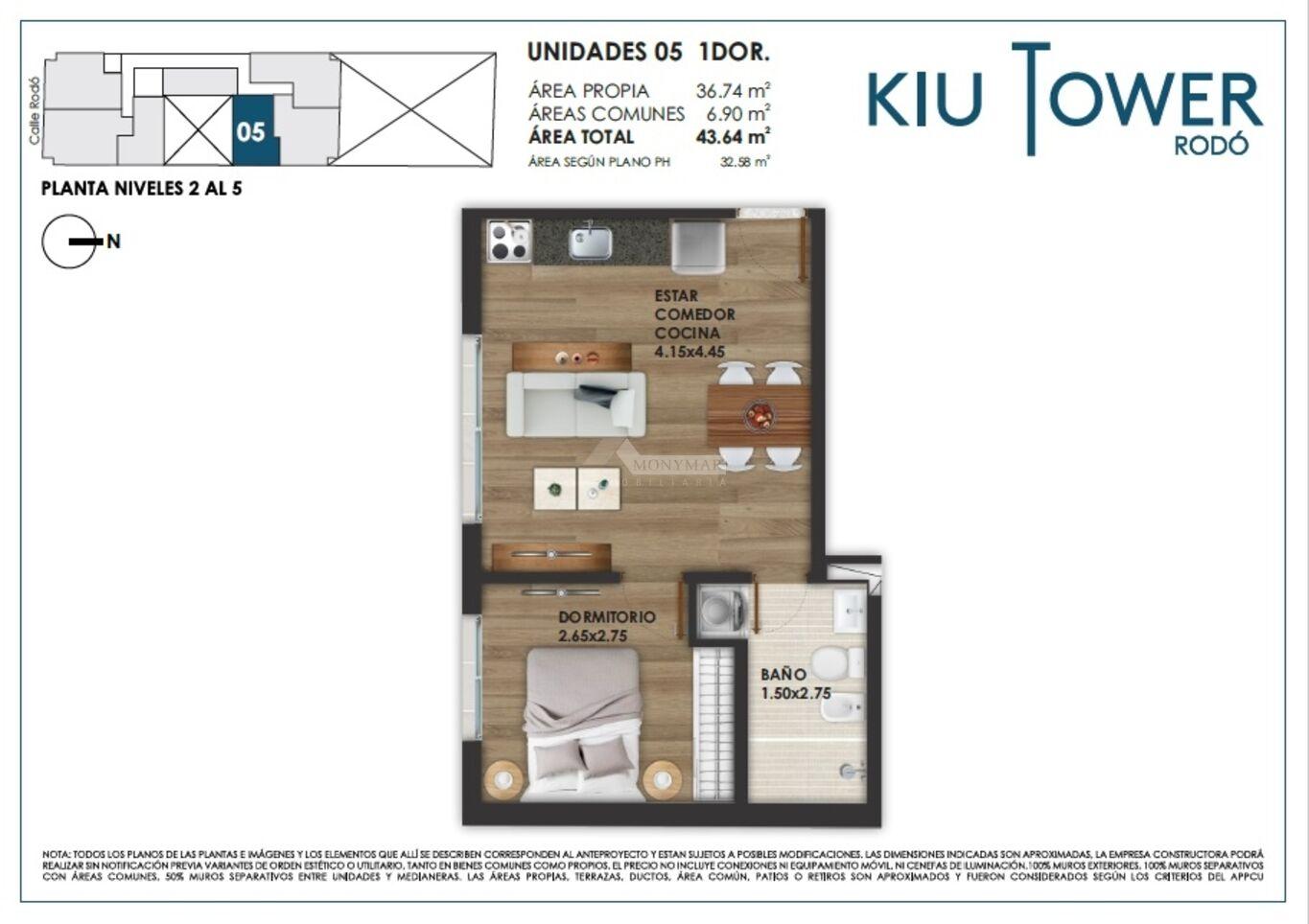 METRAJE: 36,74m área propia + 6,90m área común = 43,64m totales