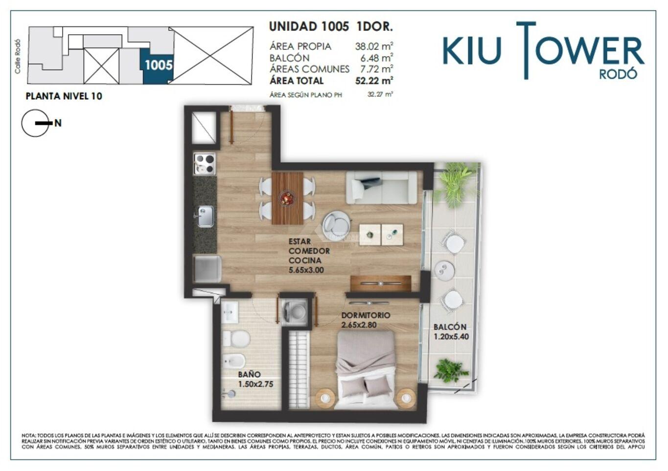 METRAJE: 38,02m área propia + 7,72m área común + 6,48m terraza = 52,22m totales