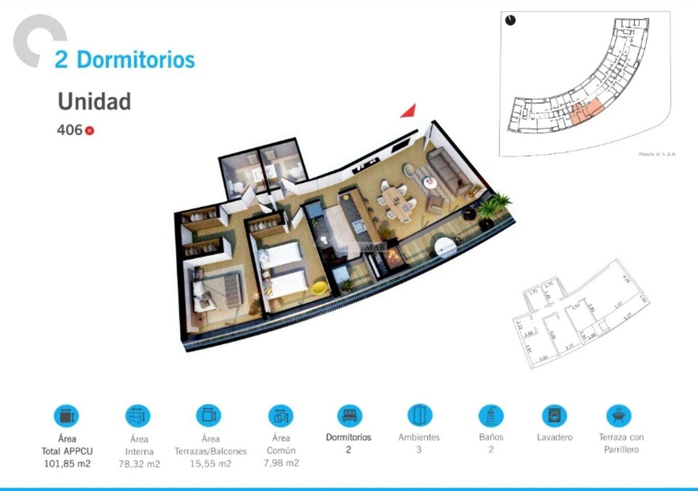 406) Área Total: 101,85 m2 (Área Privada 78,32 m2 + Área común 7,98 m2 + Terraza 15,55 m2)