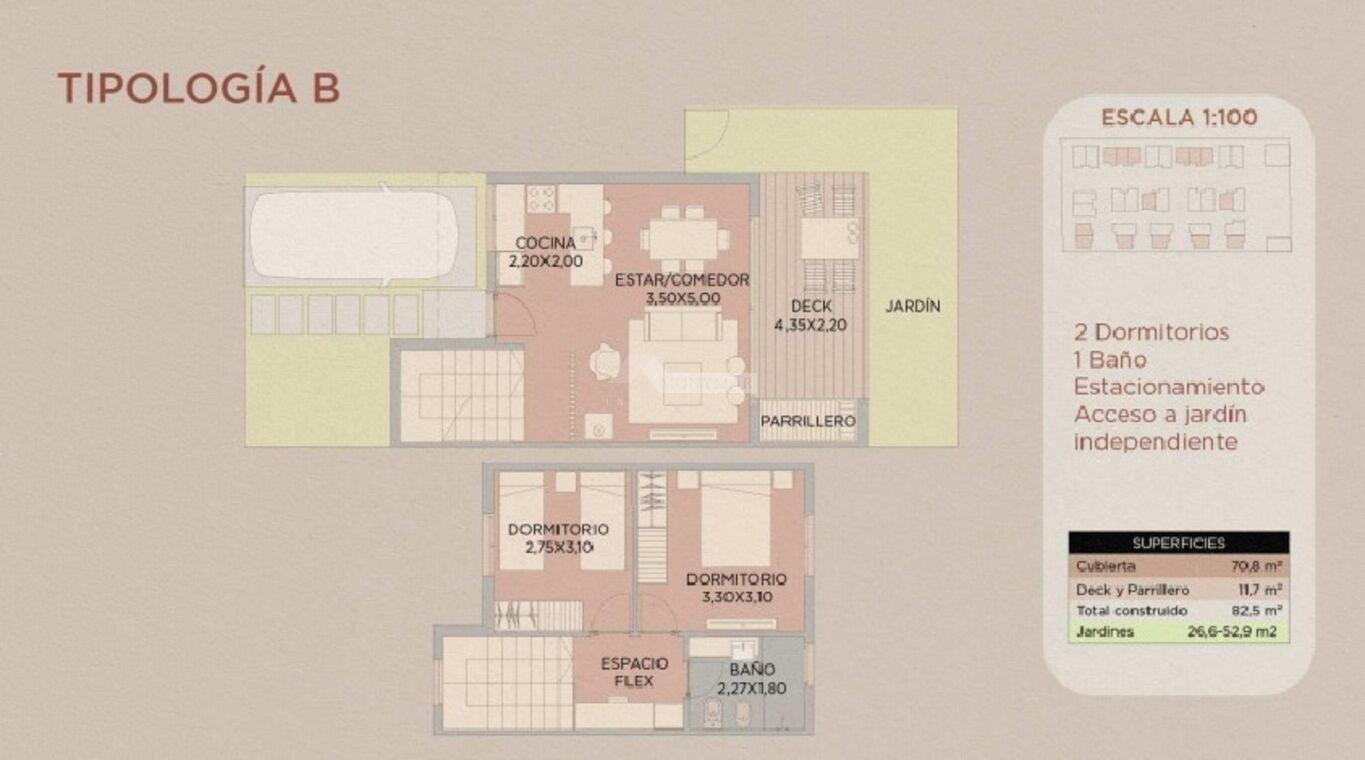 016) 70,8m2 cubiertos + 11,7m2 deck y parrillero = Total construido 82,5m2 + 39,6m2 de jardín de uso exclusivo.