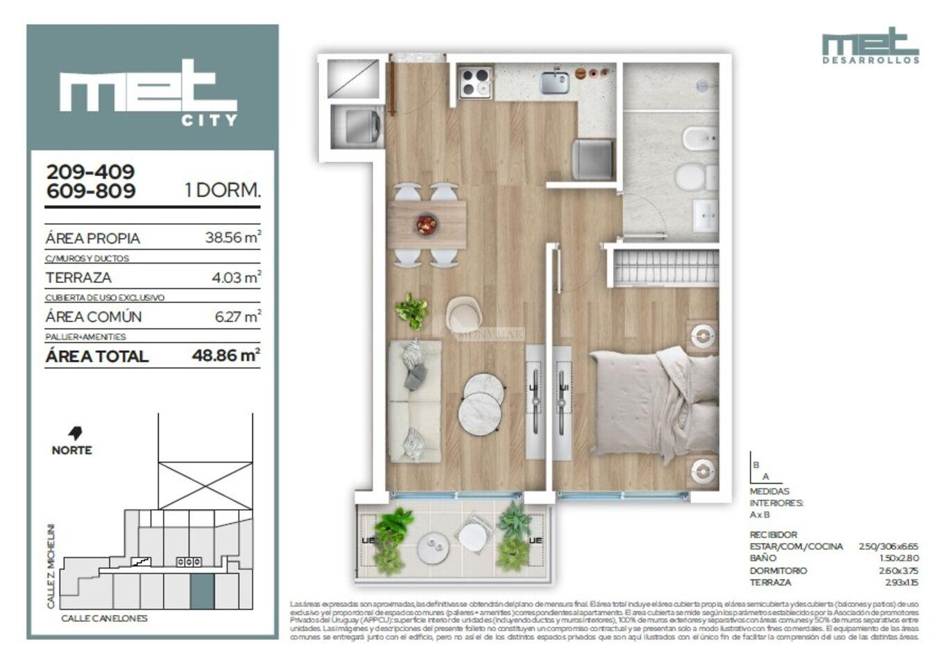 (209-409-609-809) 38,6m2 área propia c/muros + 6,3m2 área común + 4m2 terraza = 48,86m2 totales.