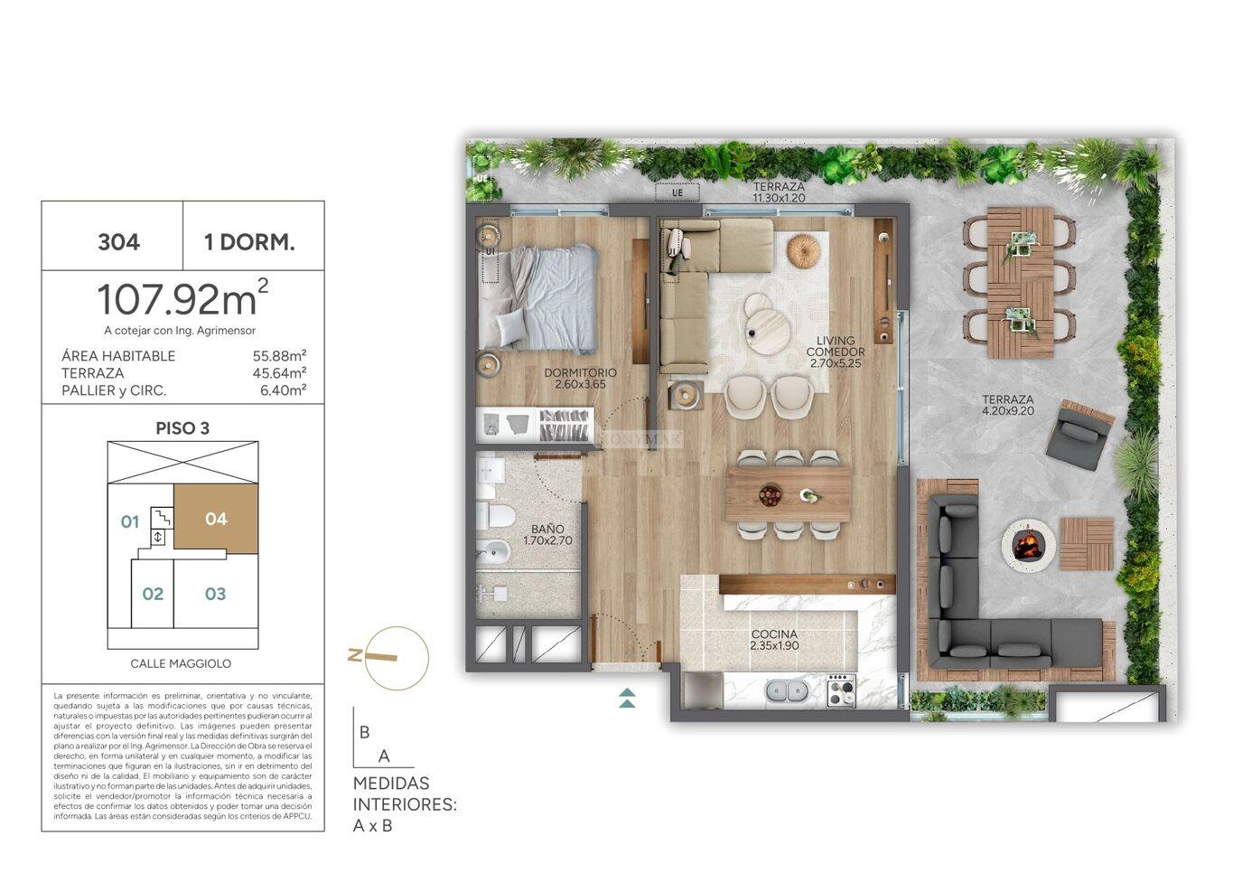 55,88m2 área privada + 6,40m2 área común + 45,64m2 área terraza = 107,92m2 totales.
