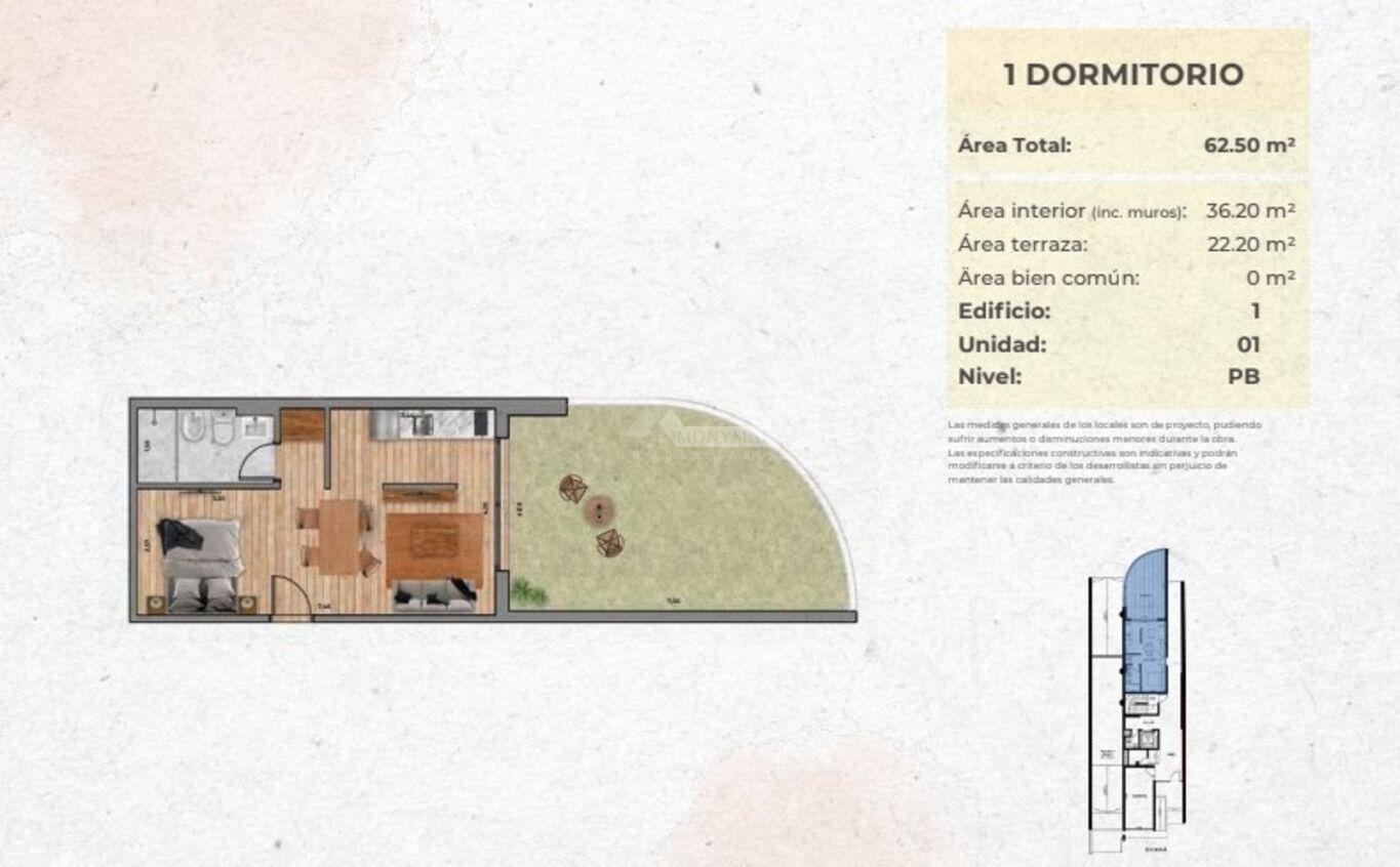 36,20m2 área privada + 22,20m2 área terraza + 4,1m2 cuotaparte de pallier & amenities = 62,50m2 totales.