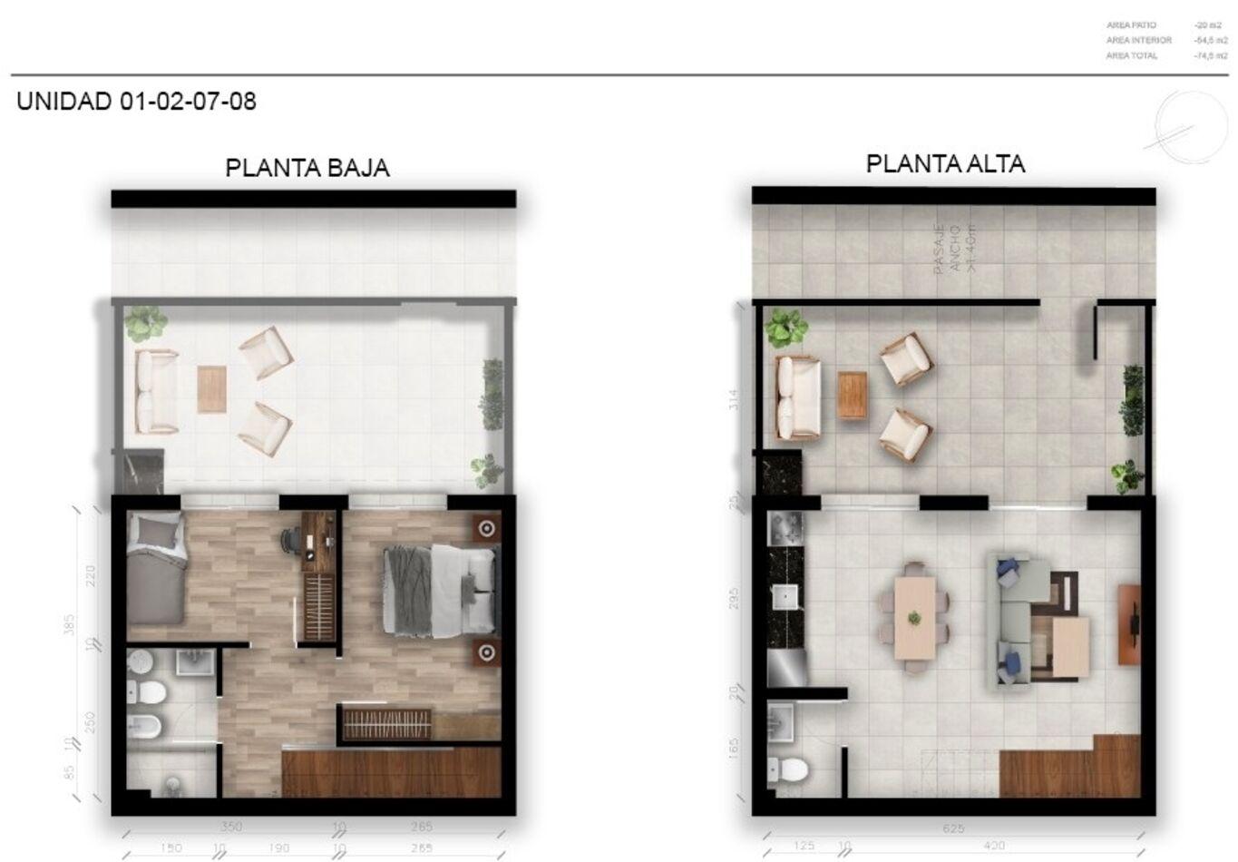 Planta Baja: PATIO AL FRENTE de 20m2 aproximadamente con conexión para lavarropas, Living comedor con cocina integrada con muebles aéreos y bajo mesada, toilette.