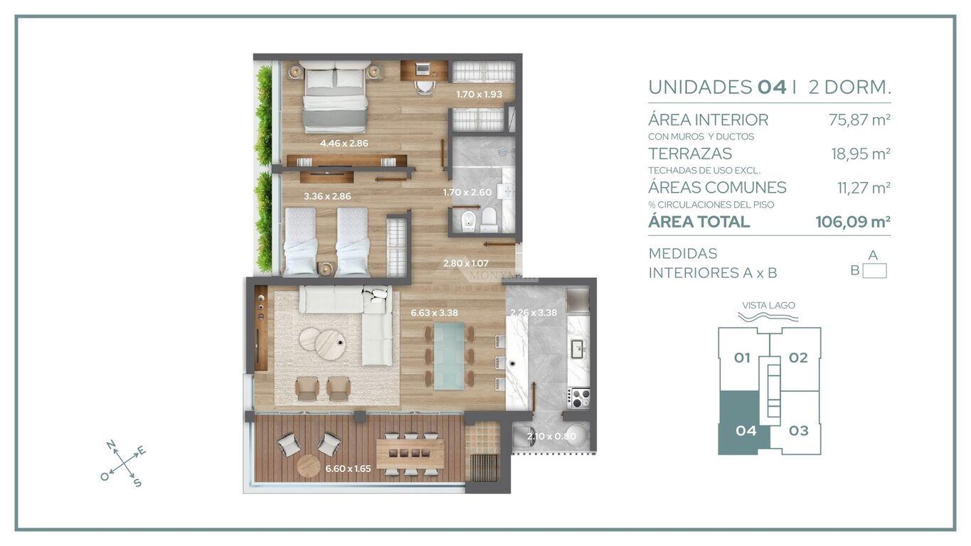 75,87m2 área propia + 11,27m2 área común + 18,95m2 terrazas = 106,09m2 totales.