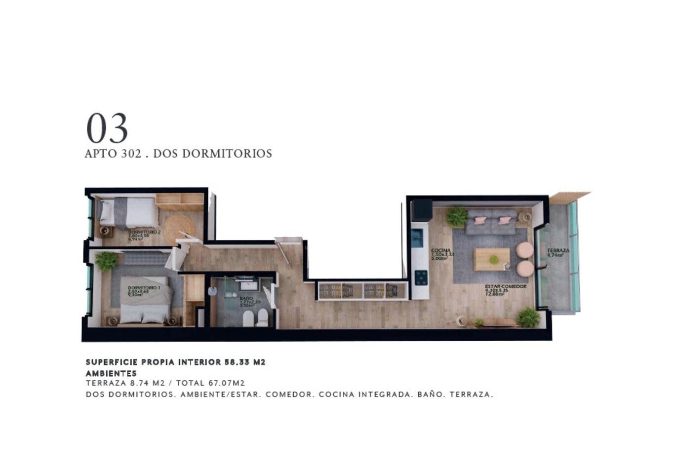 65,20m2 área privada + 4,74m2 área terraza + cuotaparte de pallier & amenities = 69,94m2 totales.
