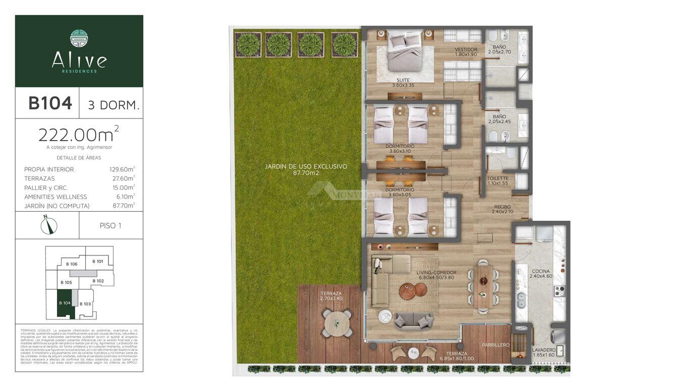 - INMOBILIARIA MONYMAR -AVENIDA DEL POLO Y LA CALETA... EDIFICIO ALIVE RESIDENCES... UBICACION PRIVILEGIADA EN BARRIO PARQUES... A 5 MINUTOS DEL CENTRO DE CARRASCO, CENTROS COMERCIALES Y DE LOS COLEGIOS MÁS IMPORTANTES DE LA CAPITAL... A 30 MINUTOS DEL CENTRO DE MONTEVIDEO...A ESTRENAR...AL FRENTE. Living comedor con salida a TERRAZA con PARRILLERO y JARDIN DE USO EXLCUSIVOS, 3 DORMITORIOS (1 en suite), 3 baños completos (1 en suite, otro completo y un toilette), cocina definida con placares aéreos y bajo mesada. GARAJE PARA 2 AUTOS. GASTOS COMUNES $ 18.500. El edificio cuenta con variedad de AMENITIES: SPA CON PISCINA INTERIOR, HIDROMASAJE, CIRCUITO DE HIDROTERAPIA TERAPÉUTICO, SALA DE MASAJES Y SAUNA SECO. ADEMÁS SALA DE GIMNASIA, ESTIRAMIENTO Y MEDITACIÓN, SALA DE RELAX, SALA DE ESTAR, SALA DE JUEGOS, 2 BARBACOAS COMPLETAS EQUIPADAS PARA 20 SERVICIOS CADA UNA, GIMNASIO DE VANGUARDIA, VESTUARIOS, SALA DE REUNIONES Y CONSULTORIO MÉDICO. ALIVE PATH: CAMINO DE CONTRASTE TÉRMICO. Podrás disfrutar de diversas RUTINAS DE ENTRENAMIENTO, incluyendo caminatas al aire libre, variadas clases de entrenamiento físico, YOGA, HIDROGYM y AQUASPINNING.