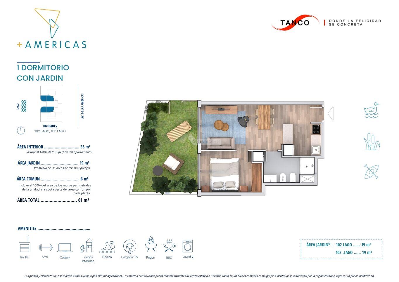 102 - 103) 36m2 área propia + 6m2 área común + 19m2 Jardín y patio = 61m2 totales.