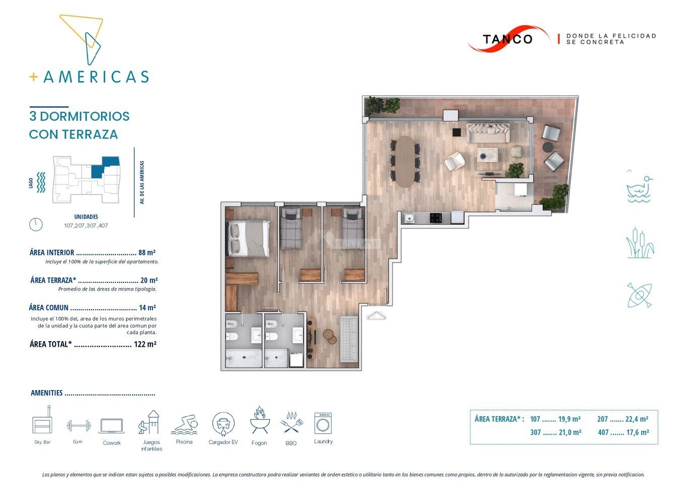 107) 88m2 área propia + 14m2 área común + 19,9m2 terraza = 121,9m2 totales.