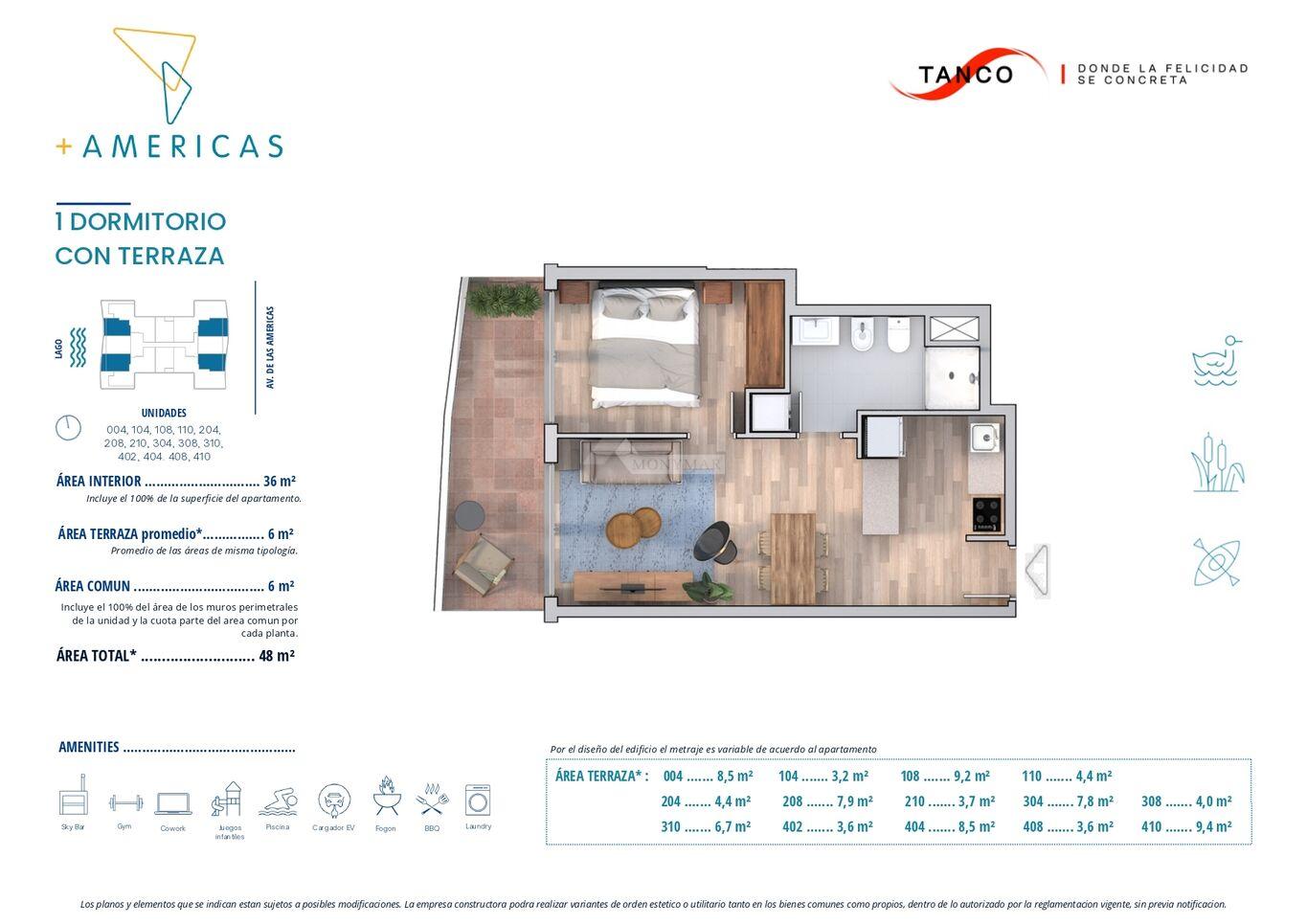 004-104-204-304-404) 36m2 área propia + 6m2 área común + 6m2 terraza promedio = 48m2 totales.