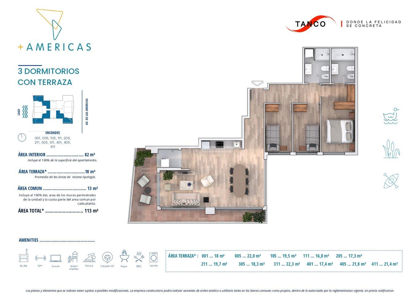 001 - 005 a 405) 82m2 área propia + 13m2 área común + 18m2 terraza promedio = 113m2 totales.