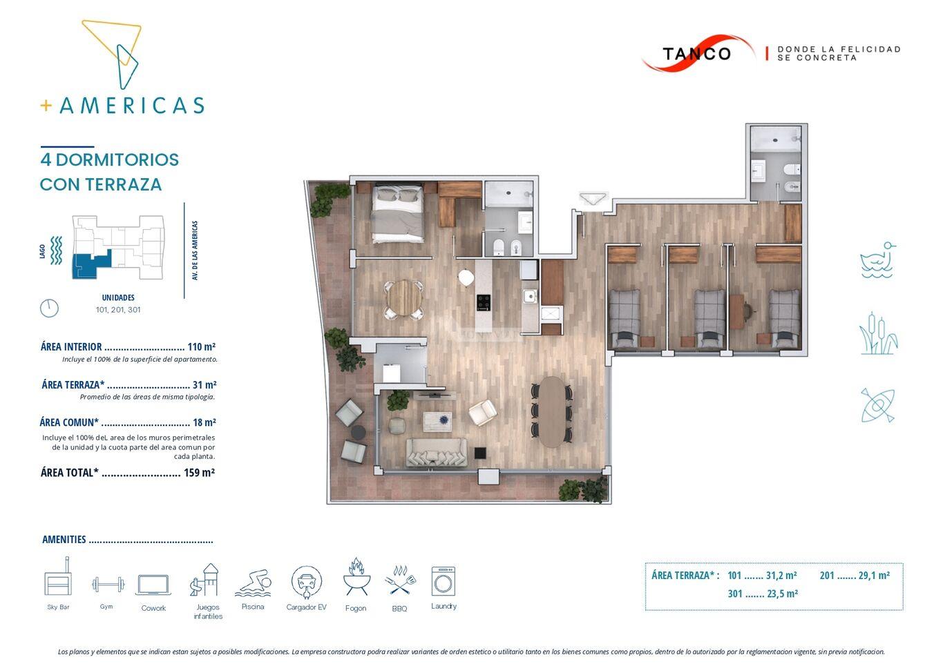 101 a 301) 110m2 área propia + 18m2 área común + 31m2 terraza promedio = 159m2 totales.