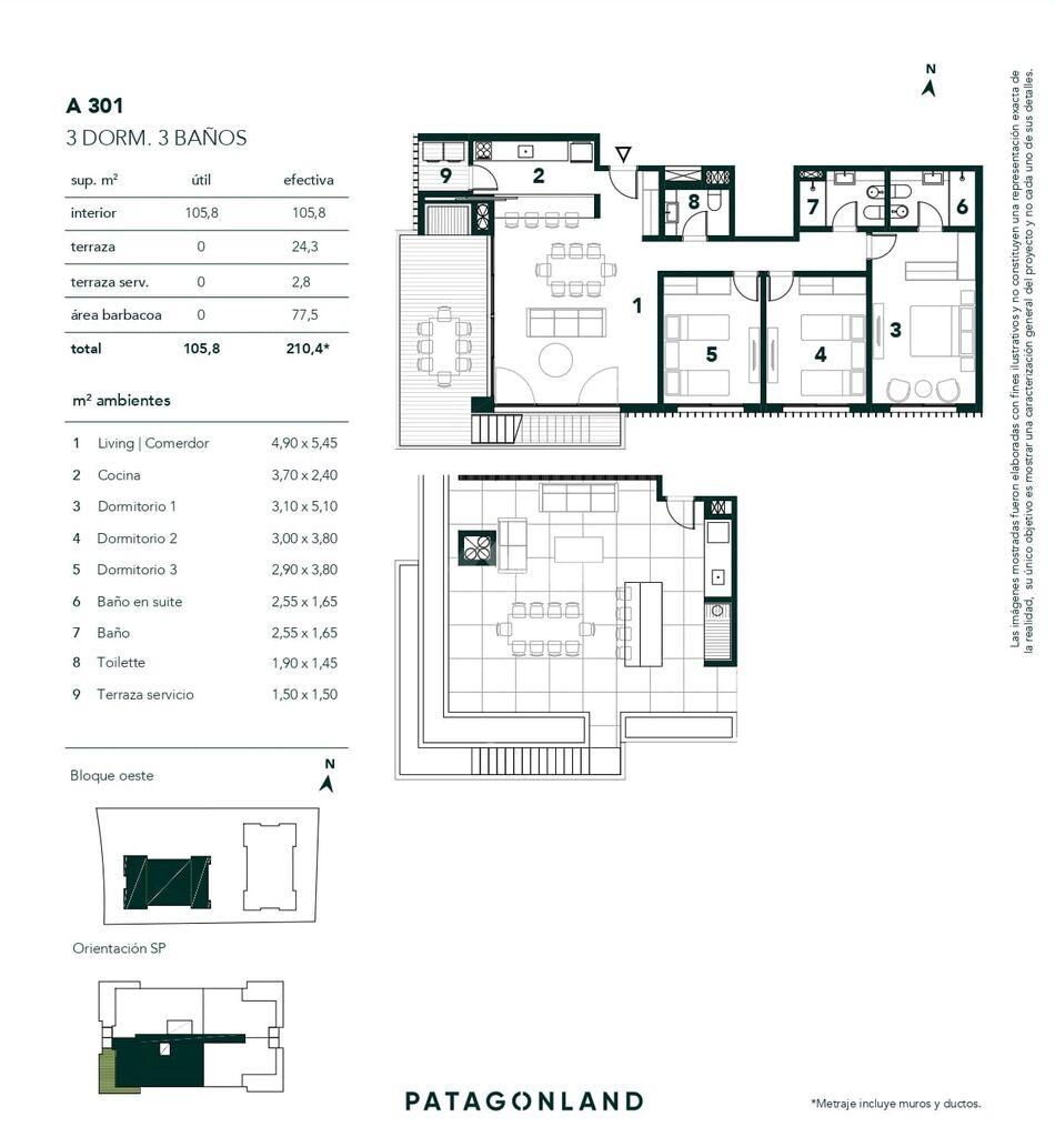 METRAJE: 105,8m2 área privada + 27,1m2 terrazas + rooftop exclusivo 77,5m2 = 210,4m2 totales.
