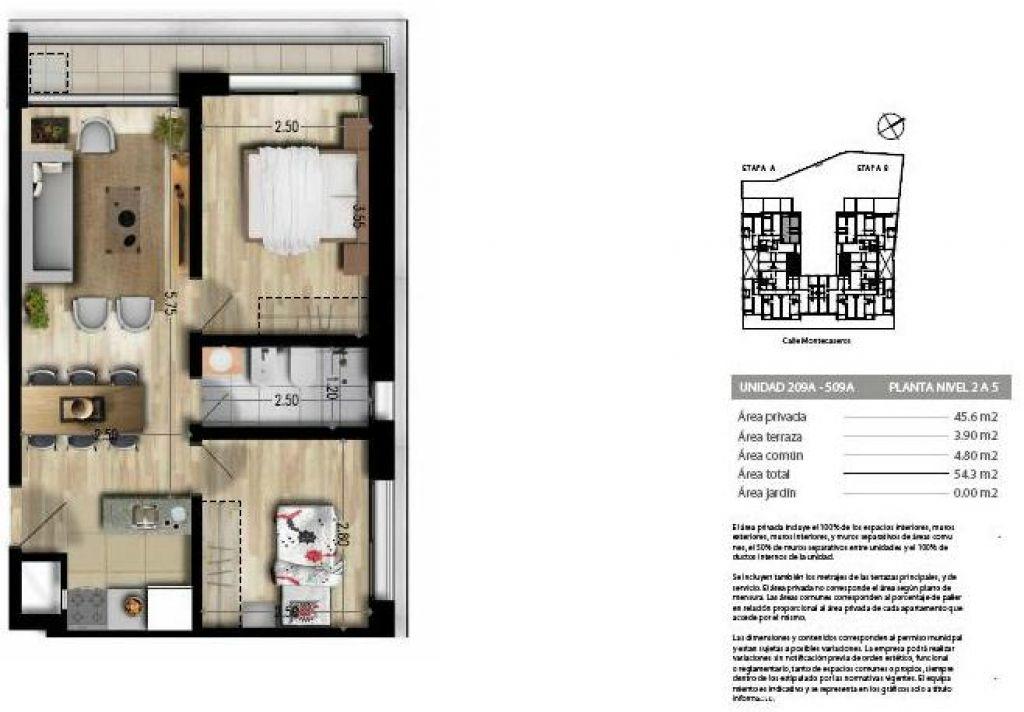209A a 509A (contrafrente) Área privada 45,6m + Área común 4,8m + Área terraza 3,9m=Área total 54,3m