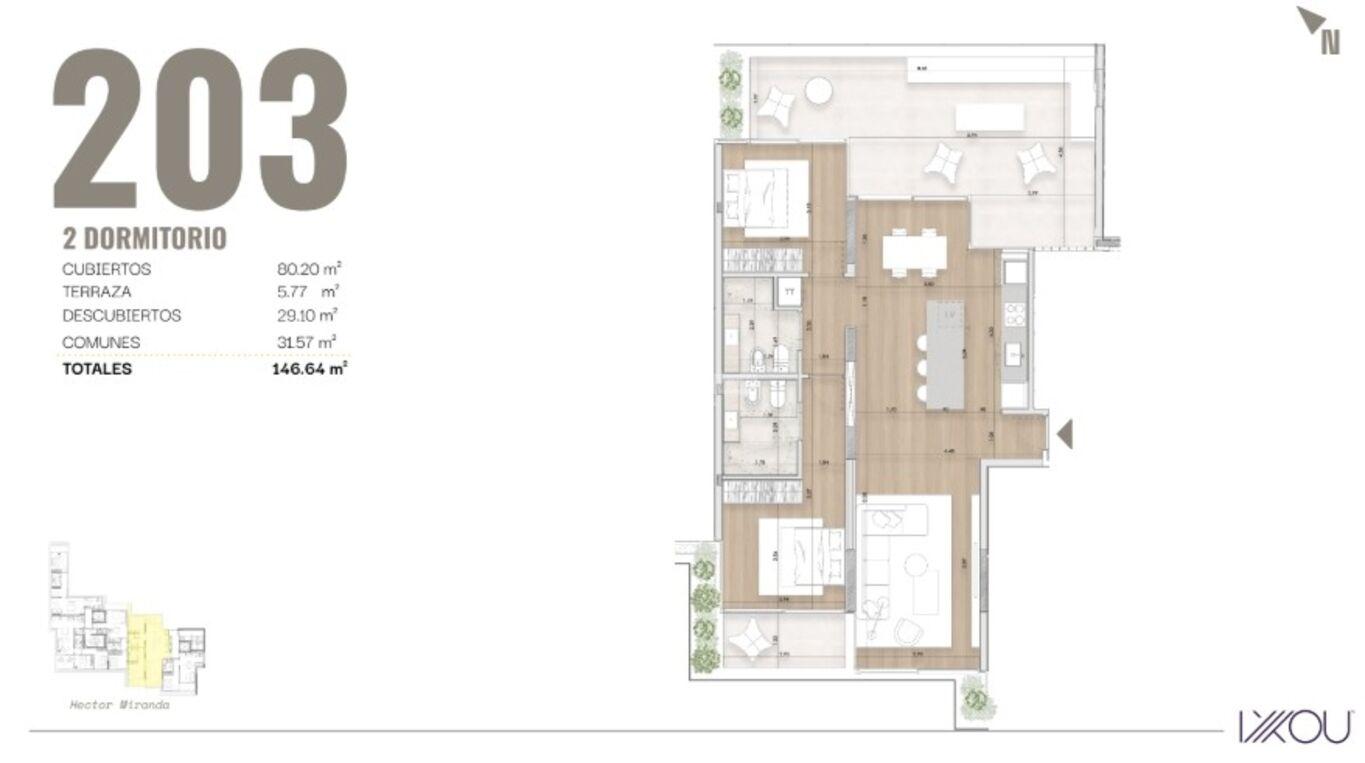 80,20m2 área interior + 31,57m2 cuota pallier + 34,87m2 área exterior = 145,64m2 Totales.