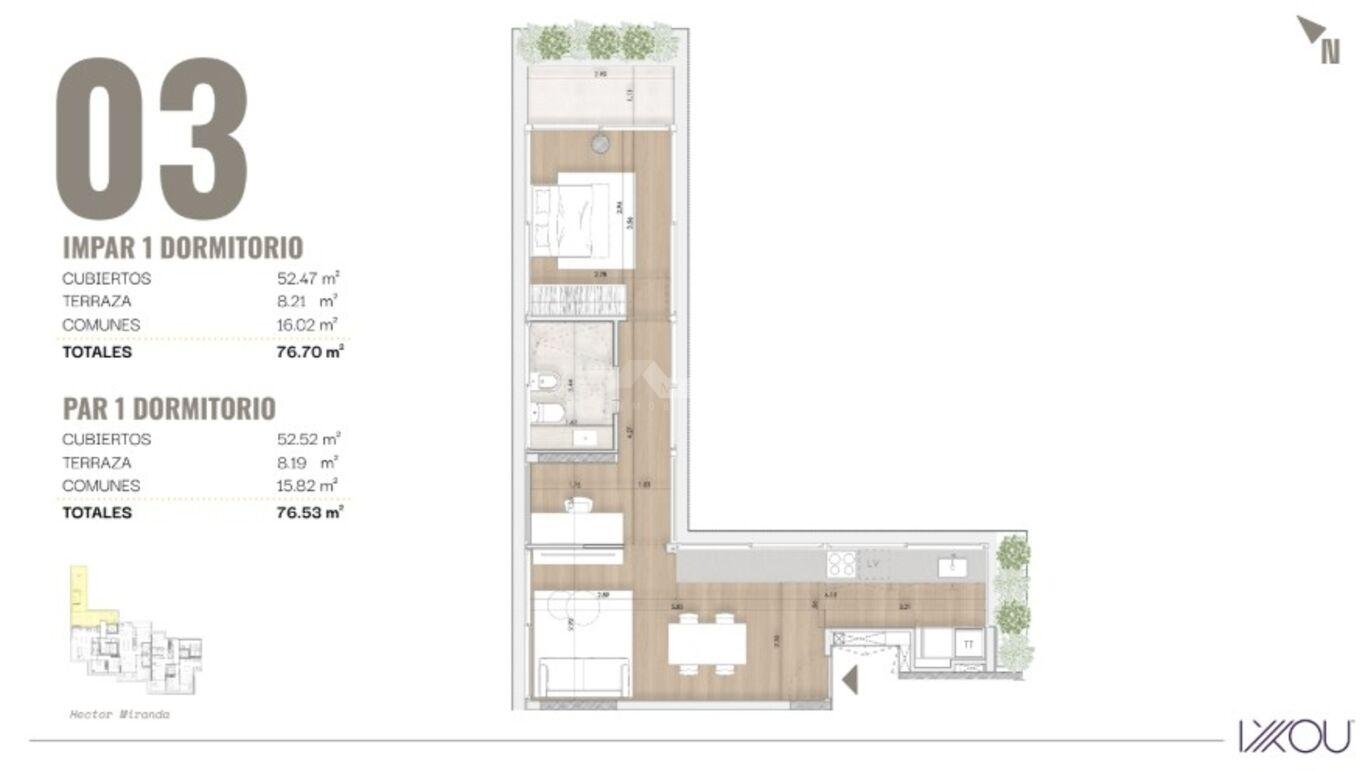 403-603) 52,52m2 área interior + 15,82m2 cuota pallier + 8,19m2 área exterior = 76,53m2 Totales.