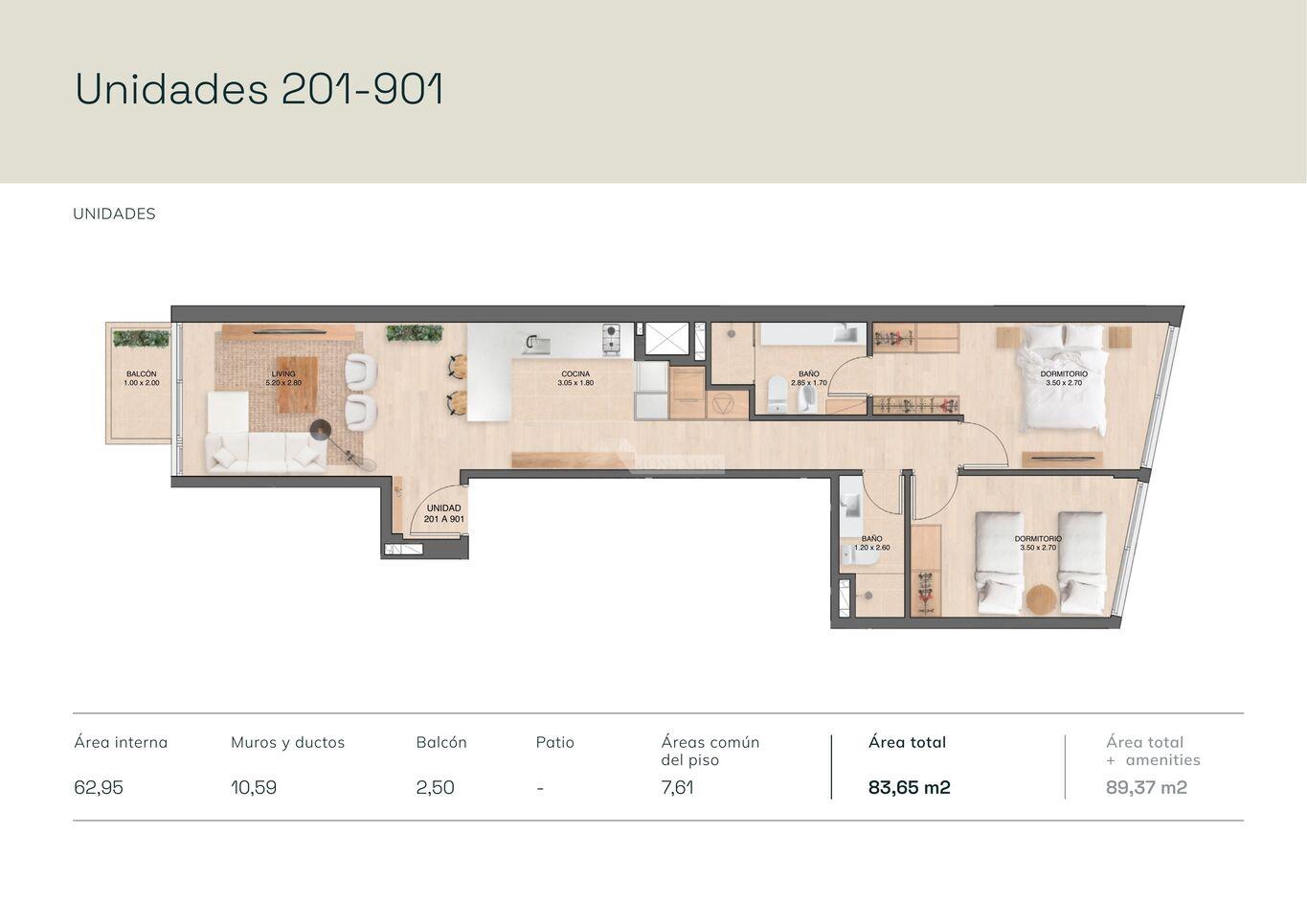 201 a 901) 62,95m2 área interior + 10,59m2 muros y ductos + 7,61m2 cuota pallier + 2,50m2 área Terraza = 83,65m2 Totales.