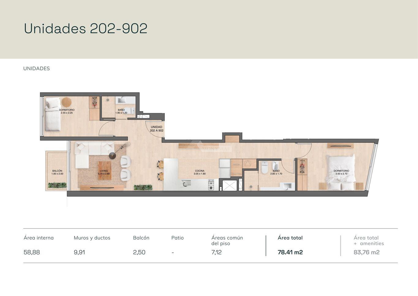 202 a 902) 58,88m2 área interior + 9,91m2 muros y ductos + 7,12m2 cuota pallier + 2,50m2 área Terraza = 78,41m2 Totales.