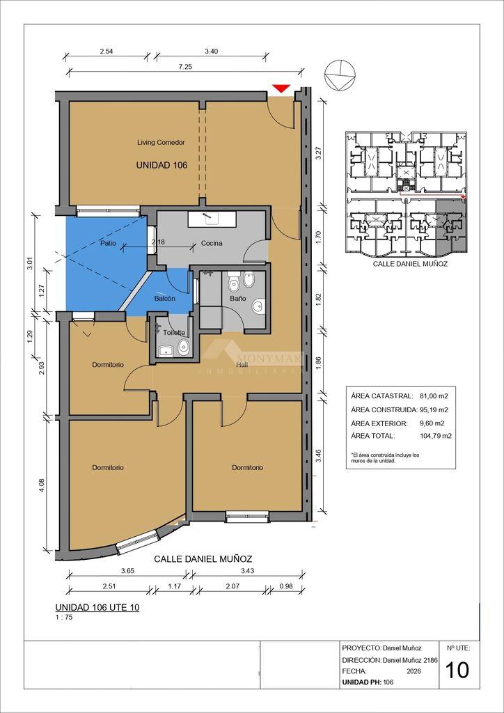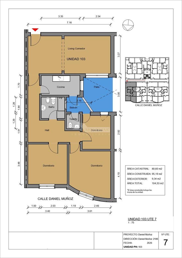 103 - 106) 95,19m2 área propia + 9,60m2 Balcón = 104,79m2 Totales.
