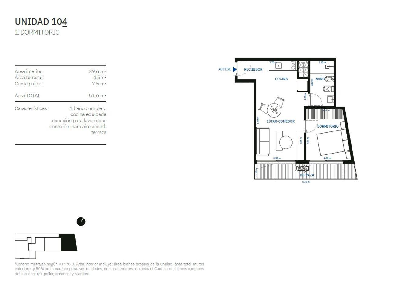 104 a 504) 39,6m2 área propia + 7,5m2 área común + 4,5m2 terraza = 51,6m2 totales.