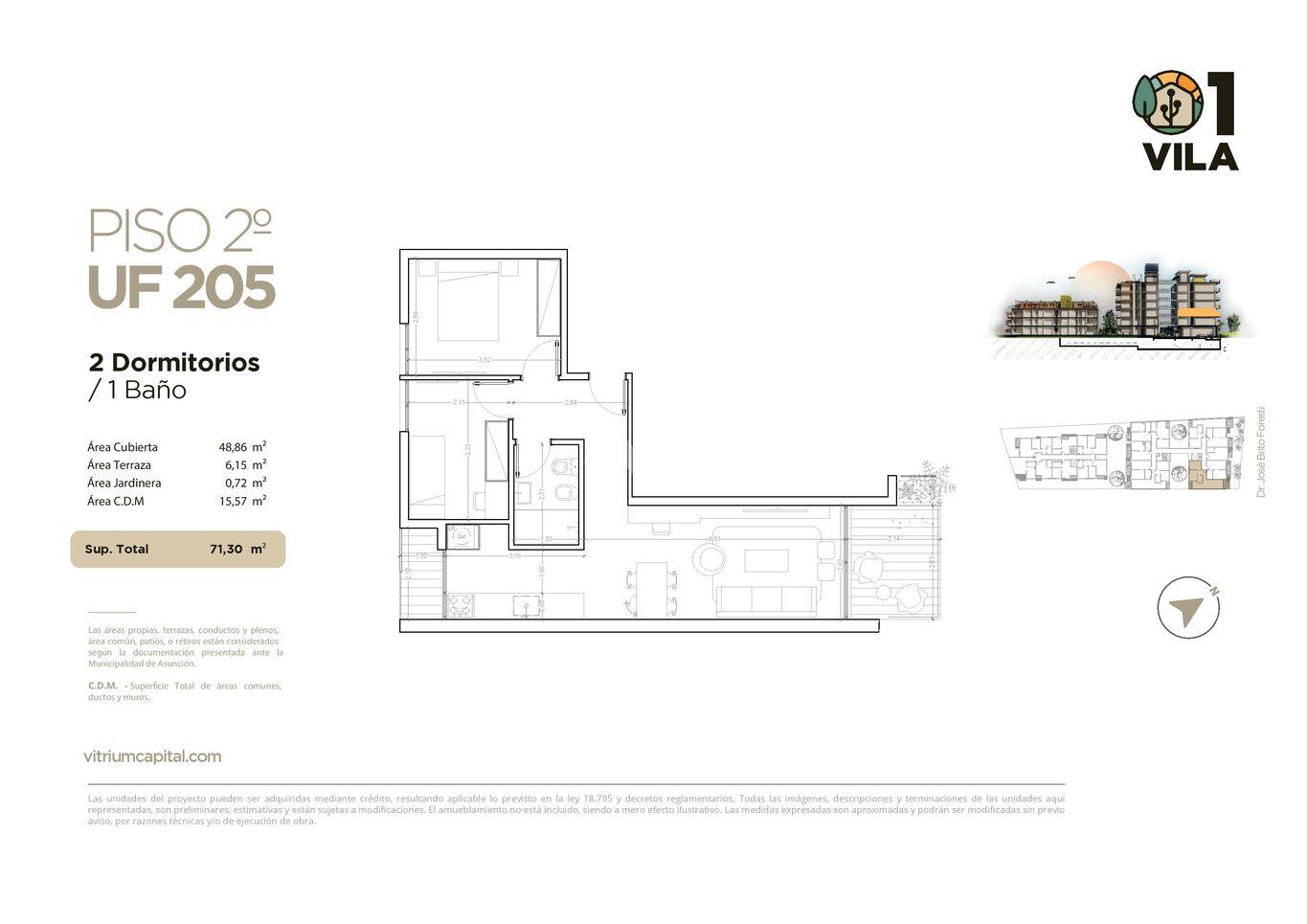 205) 48,86m área propia + 6,15m terraza + 0,72m jardinera + 15,57m área común = 71,30m Total.