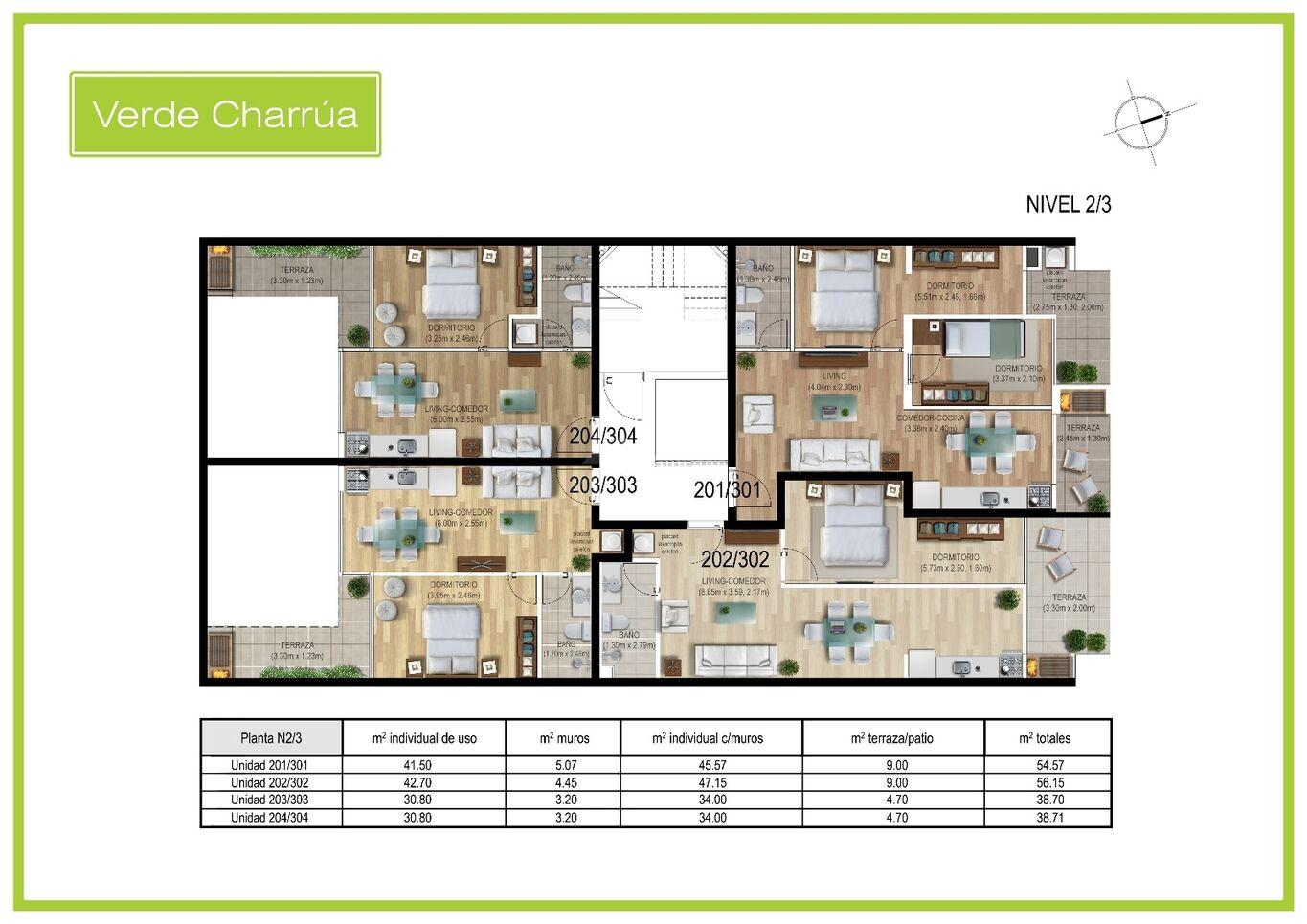 201 - 301) Total 55,37m2 (Mts mensura 41,5m2 + Muros 5,07m2 + terraza 9m2).