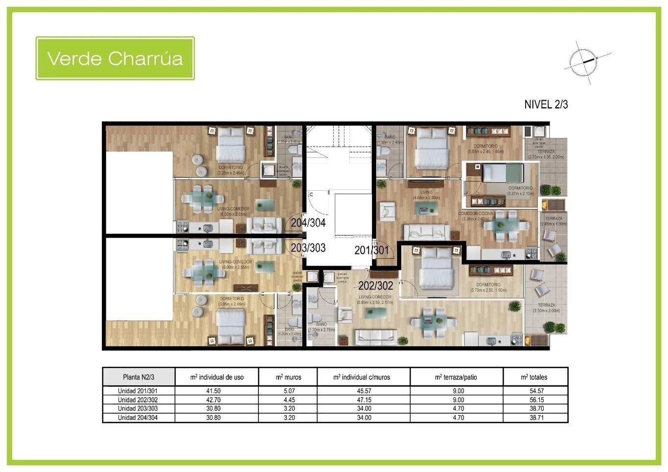 203 - 303 - 204 - 304) Total 38,7m2 (Mts mensura 30,8m2 + Muros 3,2m2 + terraza 4,7m2).