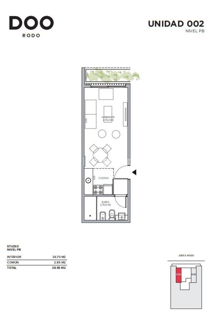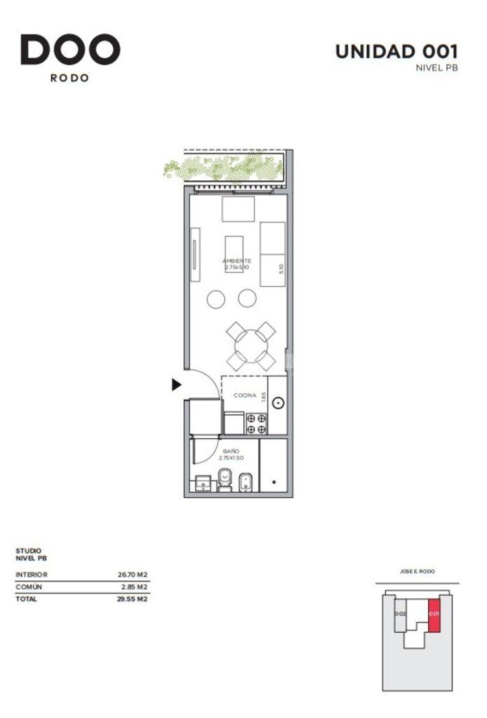 001 - 002) 26,70m2 área propia + 2,85m2 área común = 29,55m2 totales.