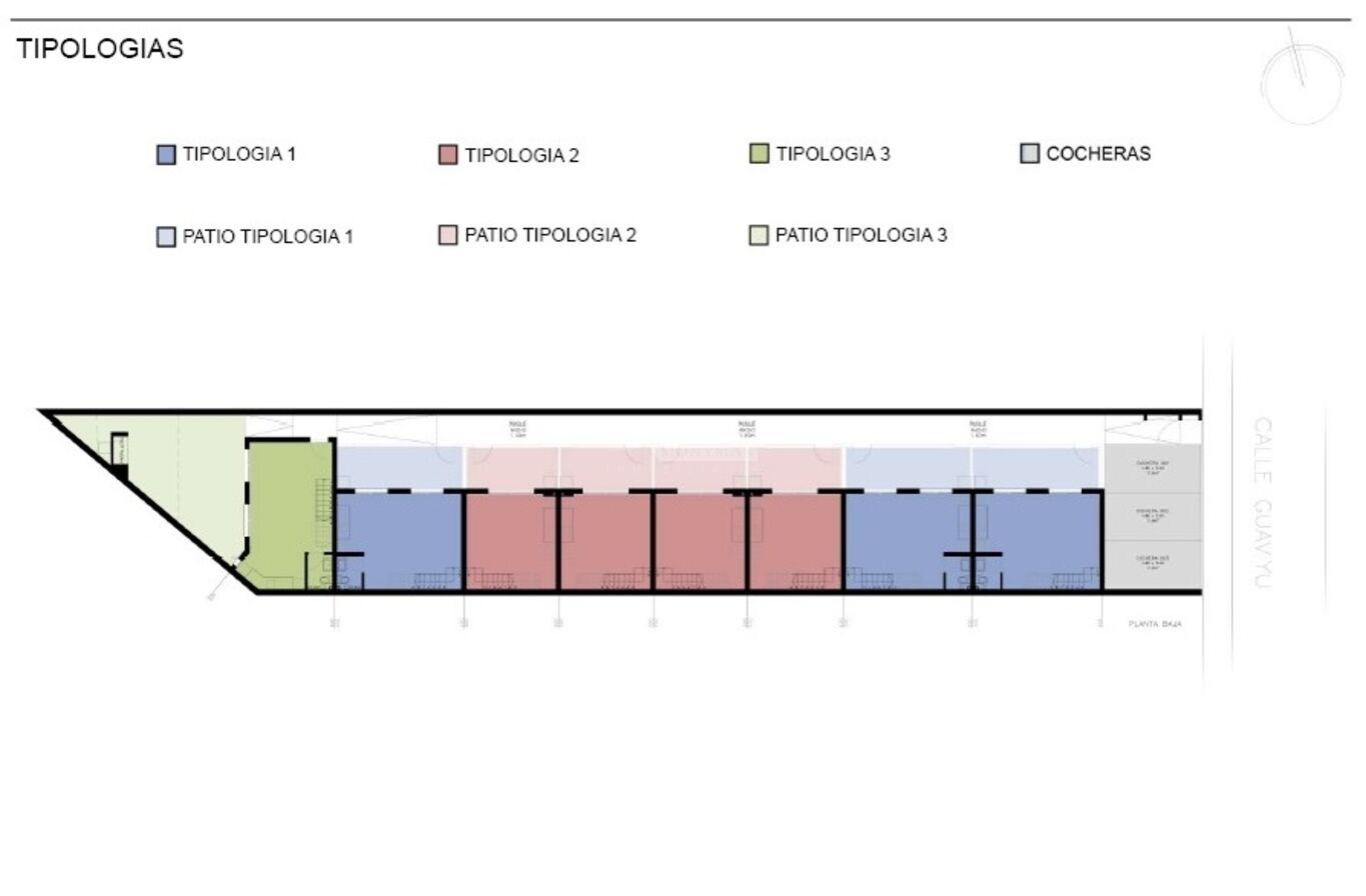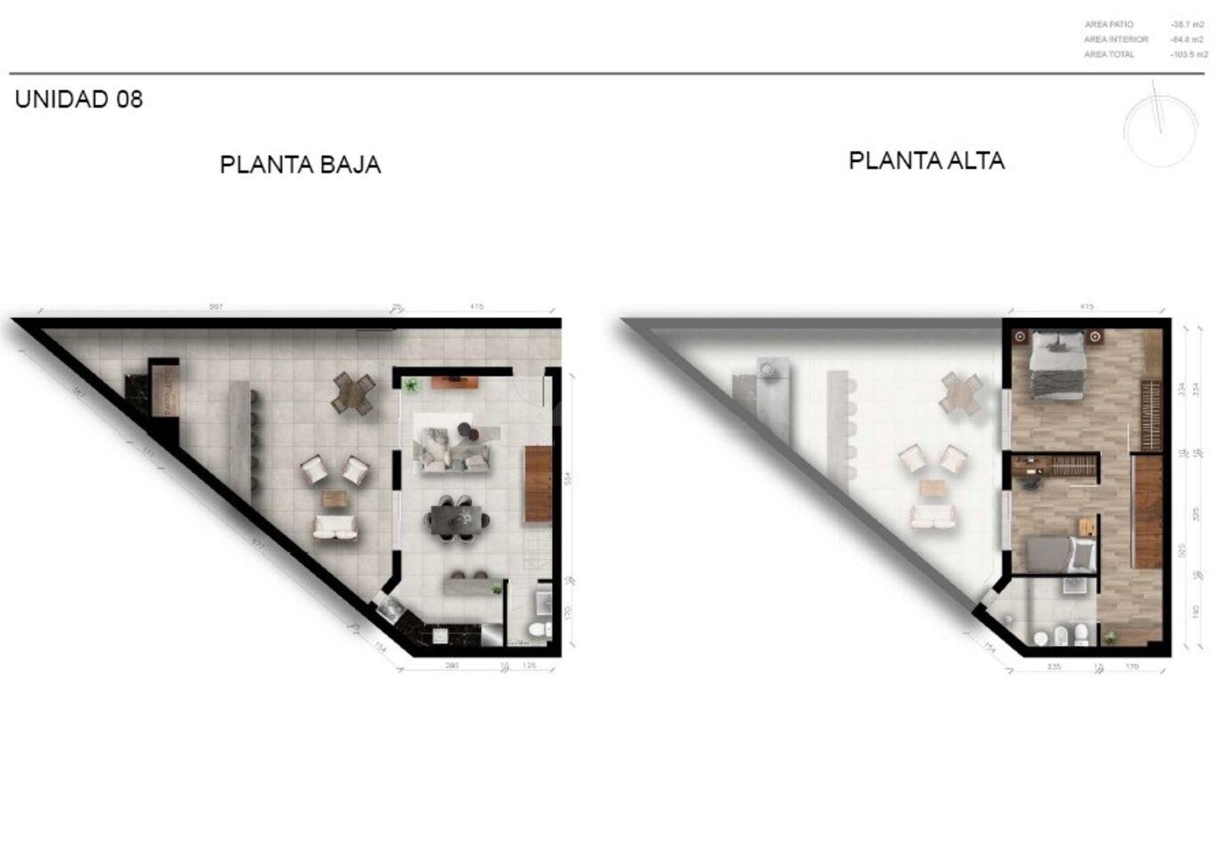 Planta Baja: PATIO de 38,7m2 aproximadamente con PARRILLERO de uso exclusivo, Living comedor con cocina integrada con muebles aéreos y bajo mesada, toilette.