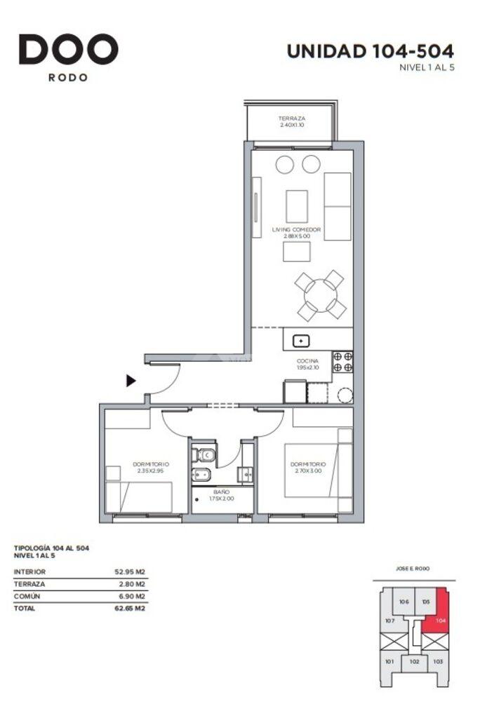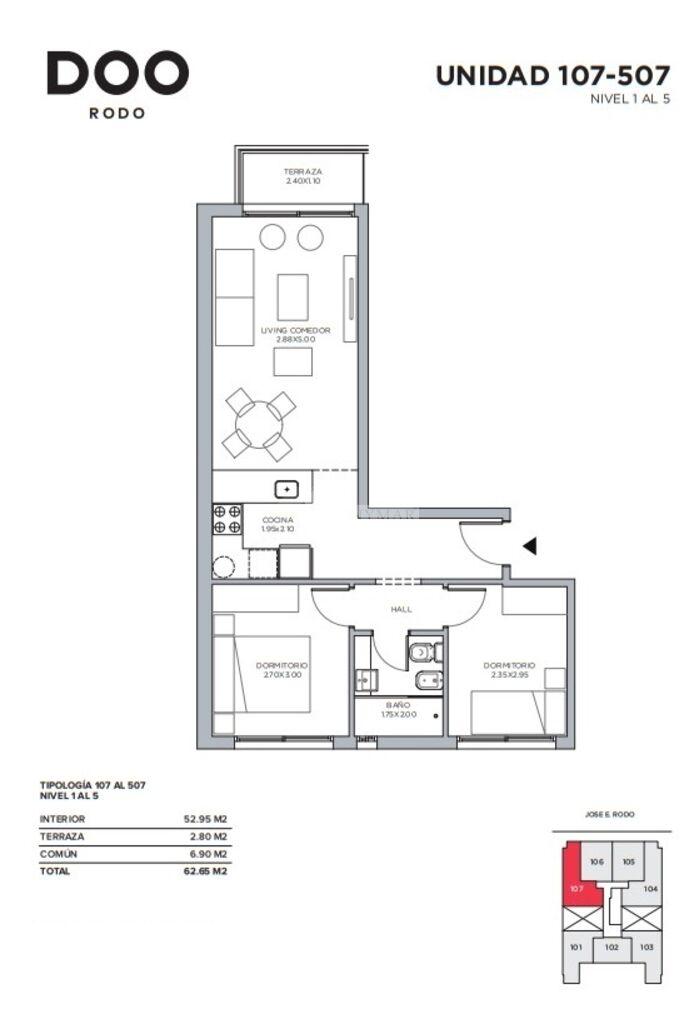 201 a 601 - 203 a 603) 42,46m2 área propia + 5,58m2 área común + 4,50m2 terraza cubierta = 52,54m2 totales.