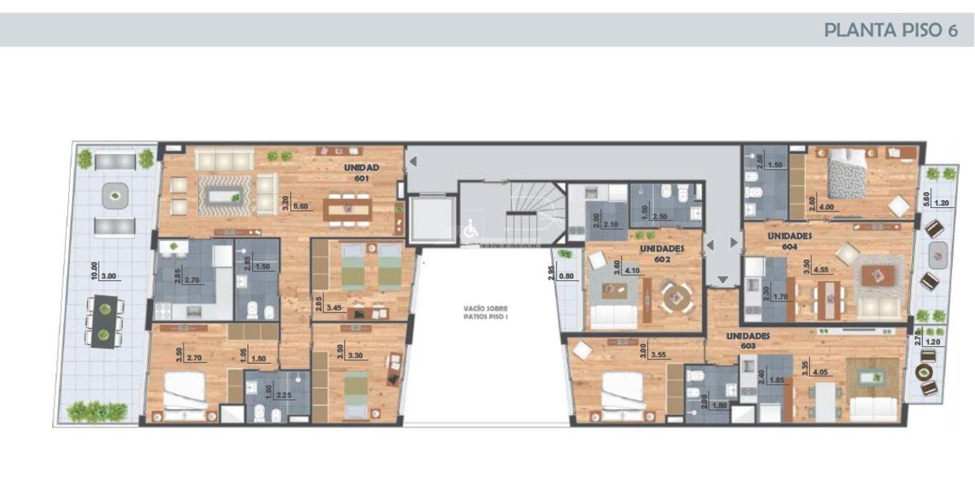 205 a 505 - 604) 58m2 área privada + 4m2 área terraza + cuotaparte de pallier & amenities = 62m2 totales.