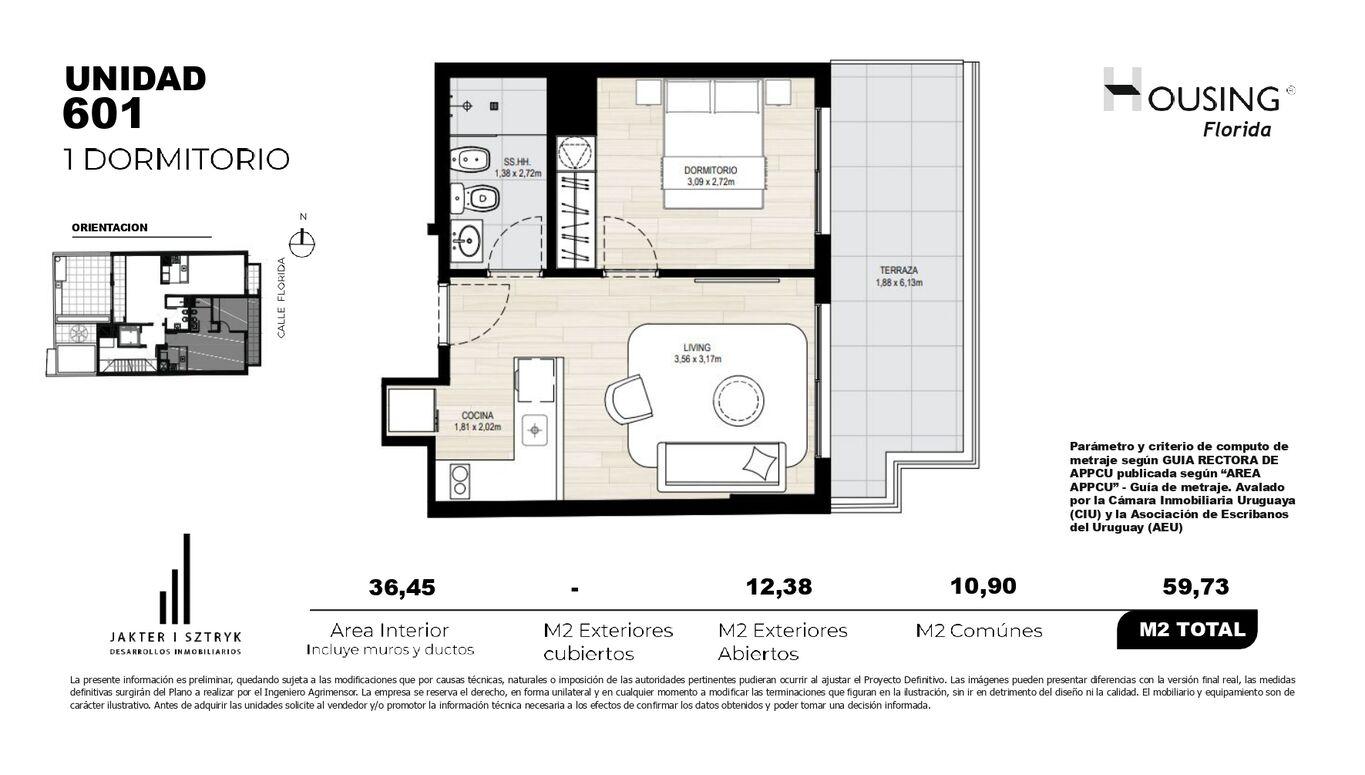METRAJE: 39,69m2 área propia + 11,09m2 área común + 15,02m2 terraza = 65,80m2 totales.