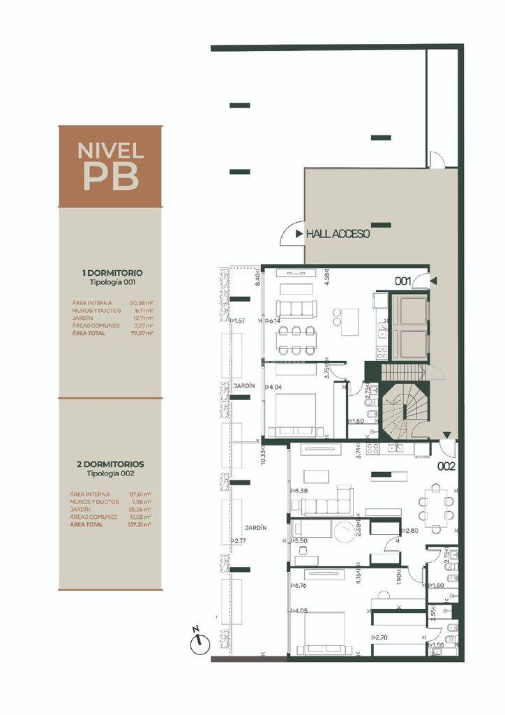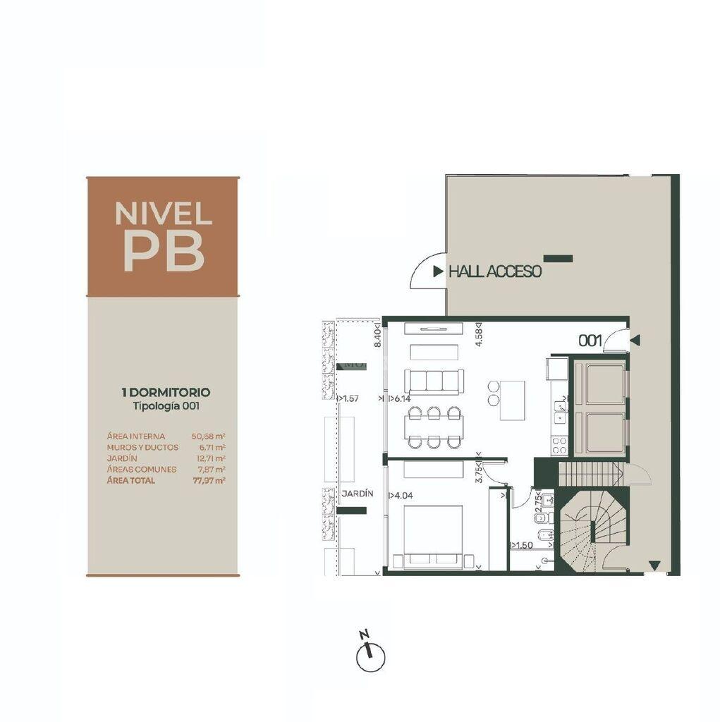 50,68m2 área propia + 7,87m2 área común + 12,71m2 Jardín Exclusivo = 77,97m2 totales.