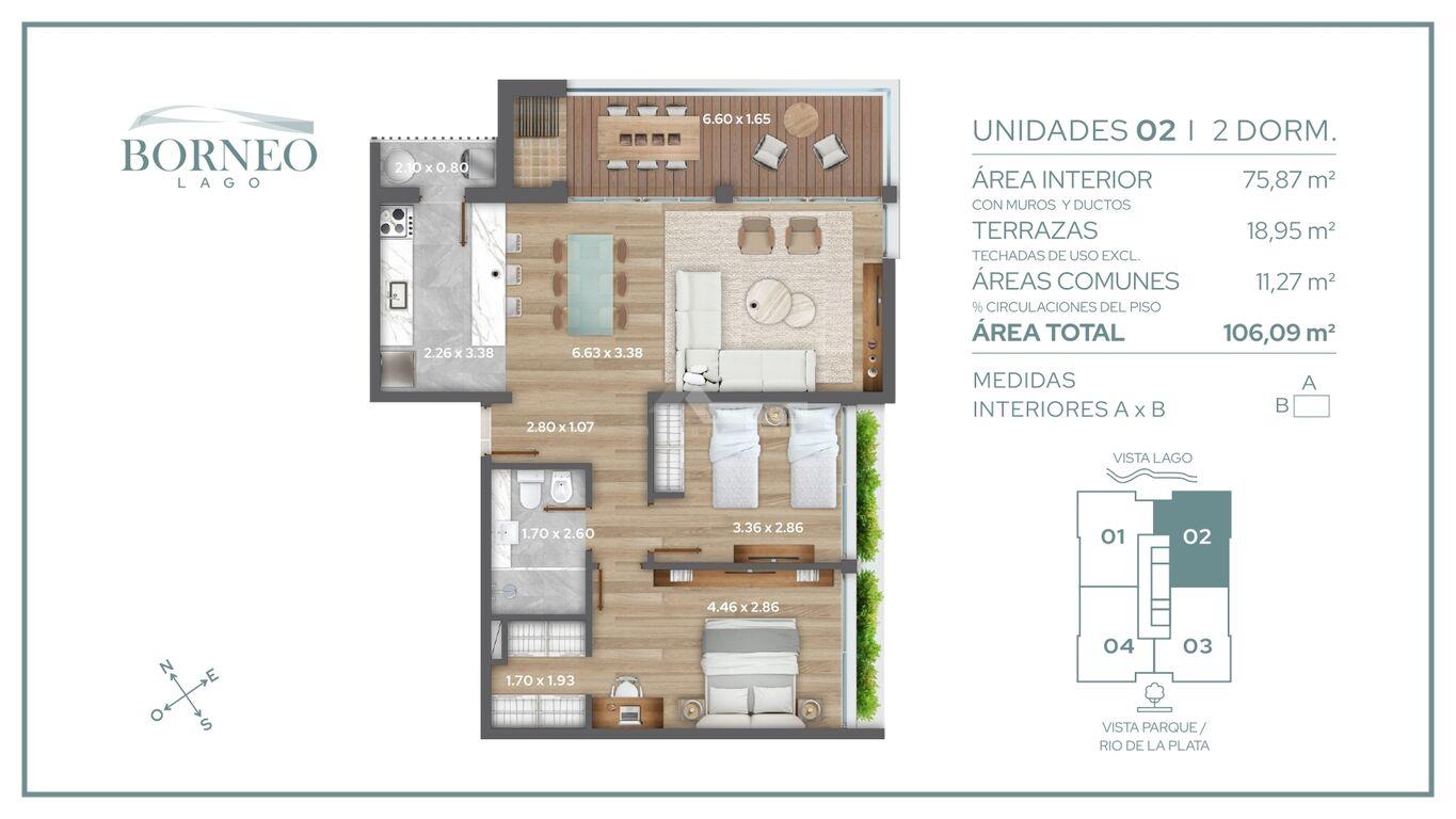202 a 1302) 75,87m2 área propia + 11,27m2 área común + 18,95m2 terrazas = 106,09m2 totales.